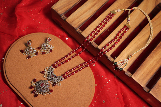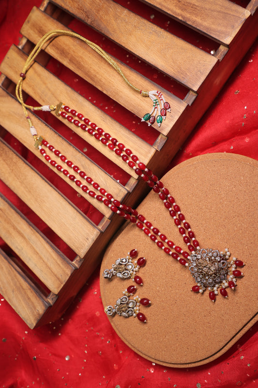 Aaradhya - Polki and Diamond Pendant with Red Quartz Beads and Earrings