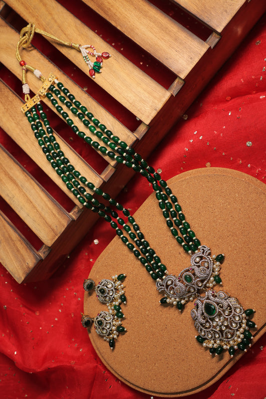 Aaradhya - Polki and Diamond Pendant with Semiprecious Green Quartz Beads and Earrings