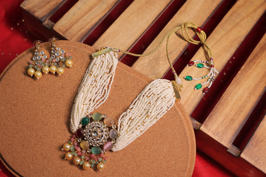 Aaradhya - Navratan Polki and Pearl Choker with Earrings
