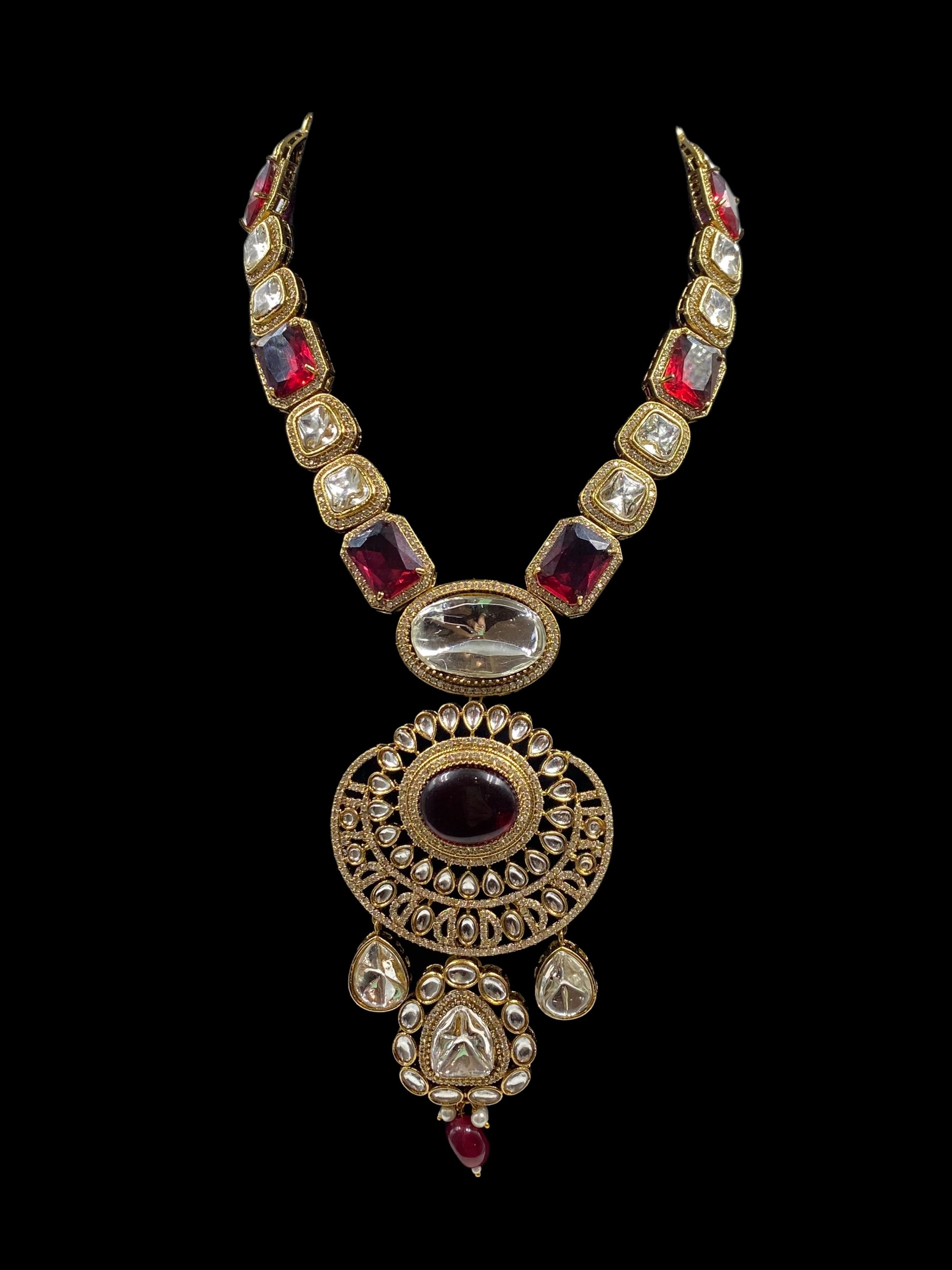 Rajputana - Traditional Red Long Polki Ensemble With Earrings