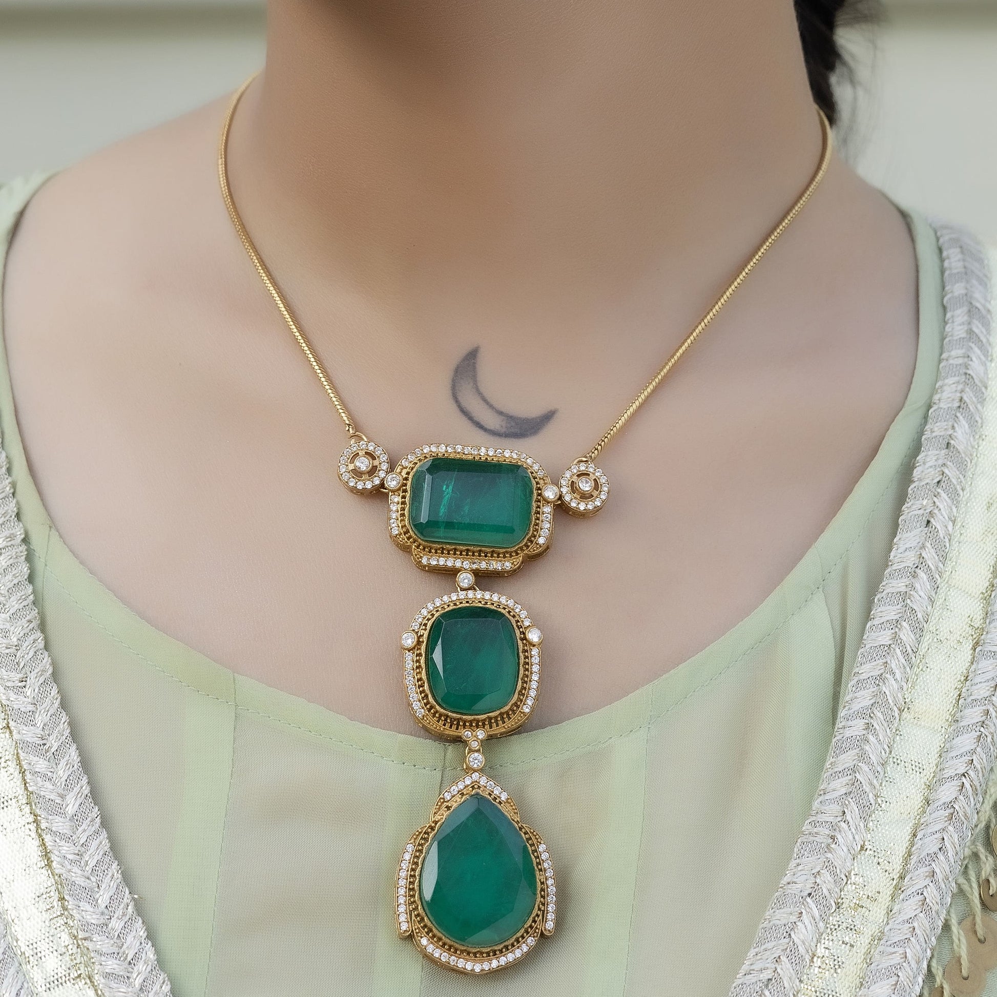Zeenat - Emerald Green Chain Necklace Set With Earrings